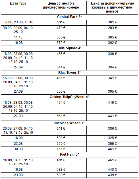 Стоимость в зависимости от даты тура и выбранного отеля: